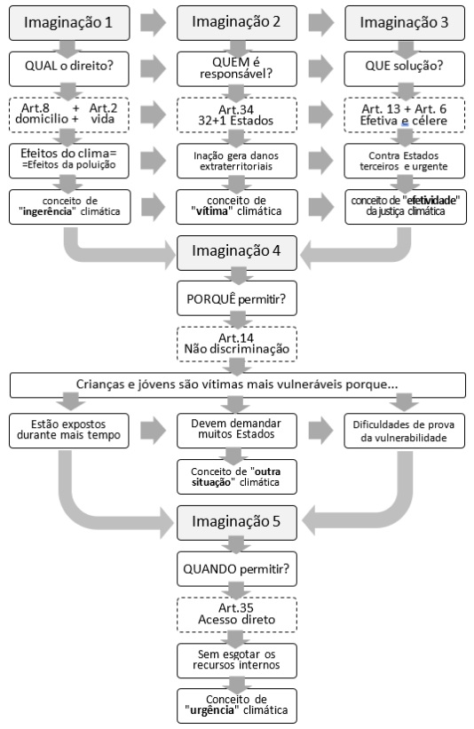 É aqui que entra a imaginação jurídica. Quando a injustiça da incapacidade dos Estados em proteger as vítimas é substancialmente agravada pela injustiça da ausência de uma decisão dos tribunais, a imaginação jurídica é essencial para alcançar uma configuração aceitável da ação, que permita a intervenção dos tribunais. Ao mesmo tempo, a configuração deve ser persuasiva da importância da pronúncia do Tribunal Europeu, para que este não se recuse a julgar a questão, por se tratar de um problema da competência do legislador ou da administração, e que permita obter uma resposta eficaz para a proteção dos direitos envolvidos, para que as obrigações de redução de emissões, ou de adaptação climática, sejam significativas e produzam resultados mensuráveis.