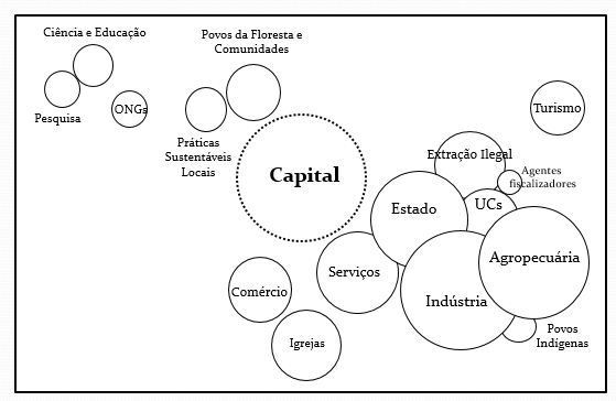 A Figura 1 demonstra a projeção dos campos de forças estabelecidos na Amazônia sob a leitura do autor. É necessário um olhar atento e a observação acerca das fronteiras que se desenham nesse ambiente, assim como as diferentes intensidades das forças exercidas pelos atores, com projeções em tamanhos proporcionais às suas forças. Em uma imagem comum à toda a Amazônia, percebe-se o capital em destaque sobre a agropecuária e indústria, setores que são protagonistas do desenvolvimento territorial, diminuindo o campo do Estado e da conservação da sociobiodiversidade. Outros campos produzidos com forças muito inferiores àquelas em torno do capital, são representados soltos no ambiente, como “Ciência e Educação” e “Pesquisa”. Essa representação apresentada aqui foi concebida pelo pesquisador à partir de sua observação como agente participante e inserido no contexto em que se levantou os dados da pesquisa. Ressalta-se que o cenário projetado, embora guarde especificidades do ambiente estudado, pode ser percebido como comum à toda Amazônia, no qual se observa a centralidade do capital ordenando as disputas e os próprios campos que se estabelecem pelo uso dos recursos e territórios.
